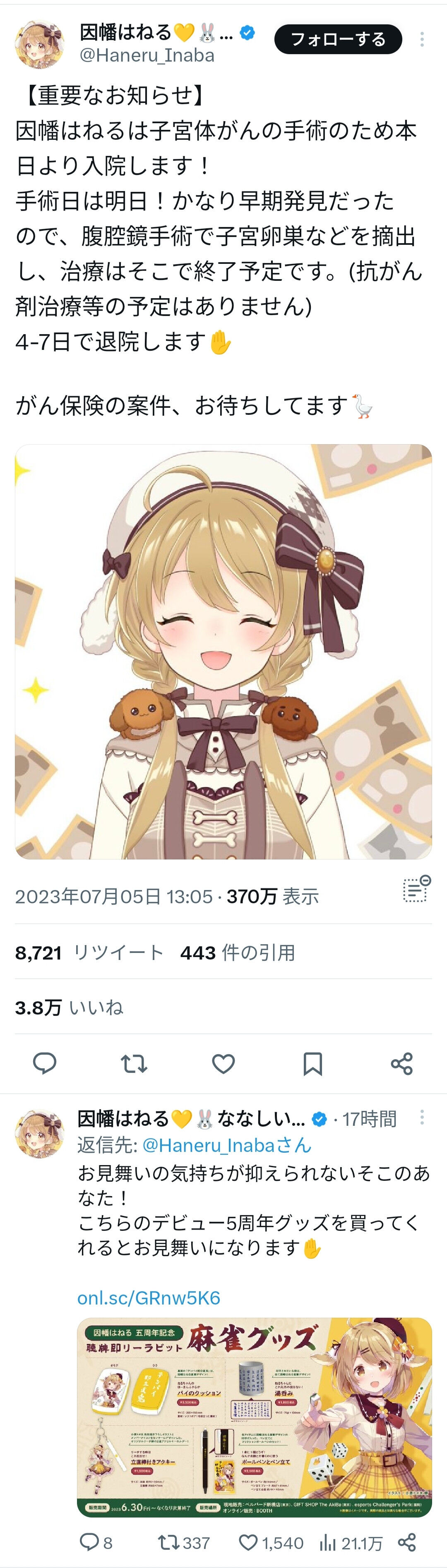 因幡はねるは子宮体がんの手術のため本日より入院します!