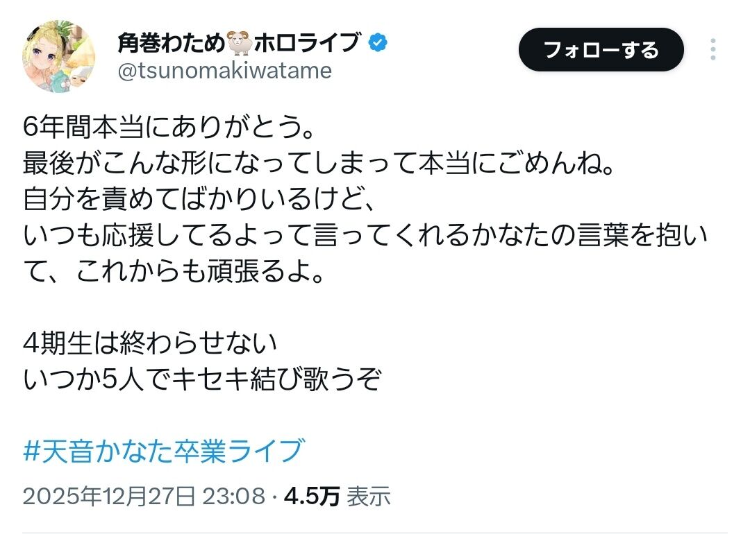 — 天音かなた💫ホロライブ(12/27卒業) (@amanekanatach) December 27, 2025
